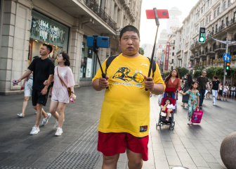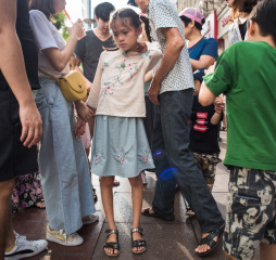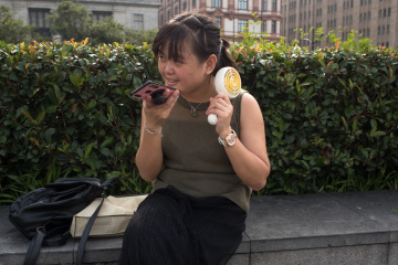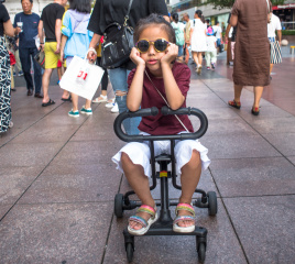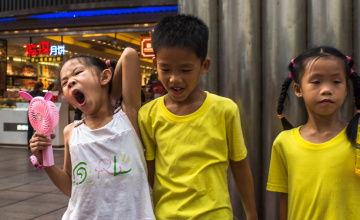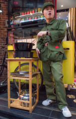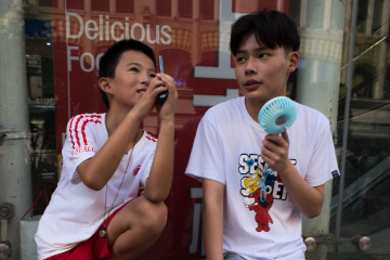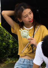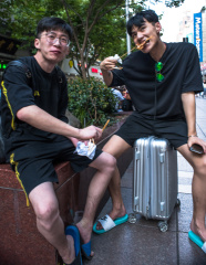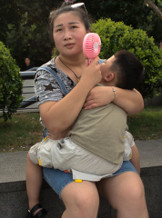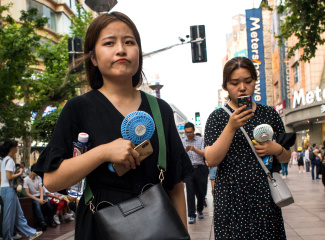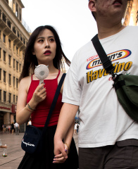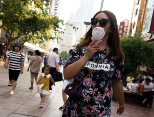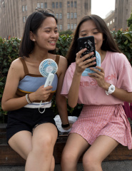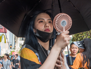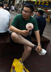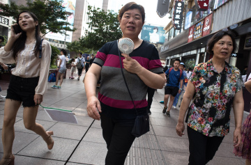 出自粤语歌《漫步人生路》。 街头酷暑中手持小风扇很受欢迎。